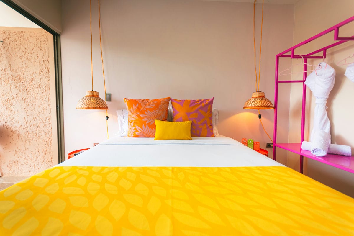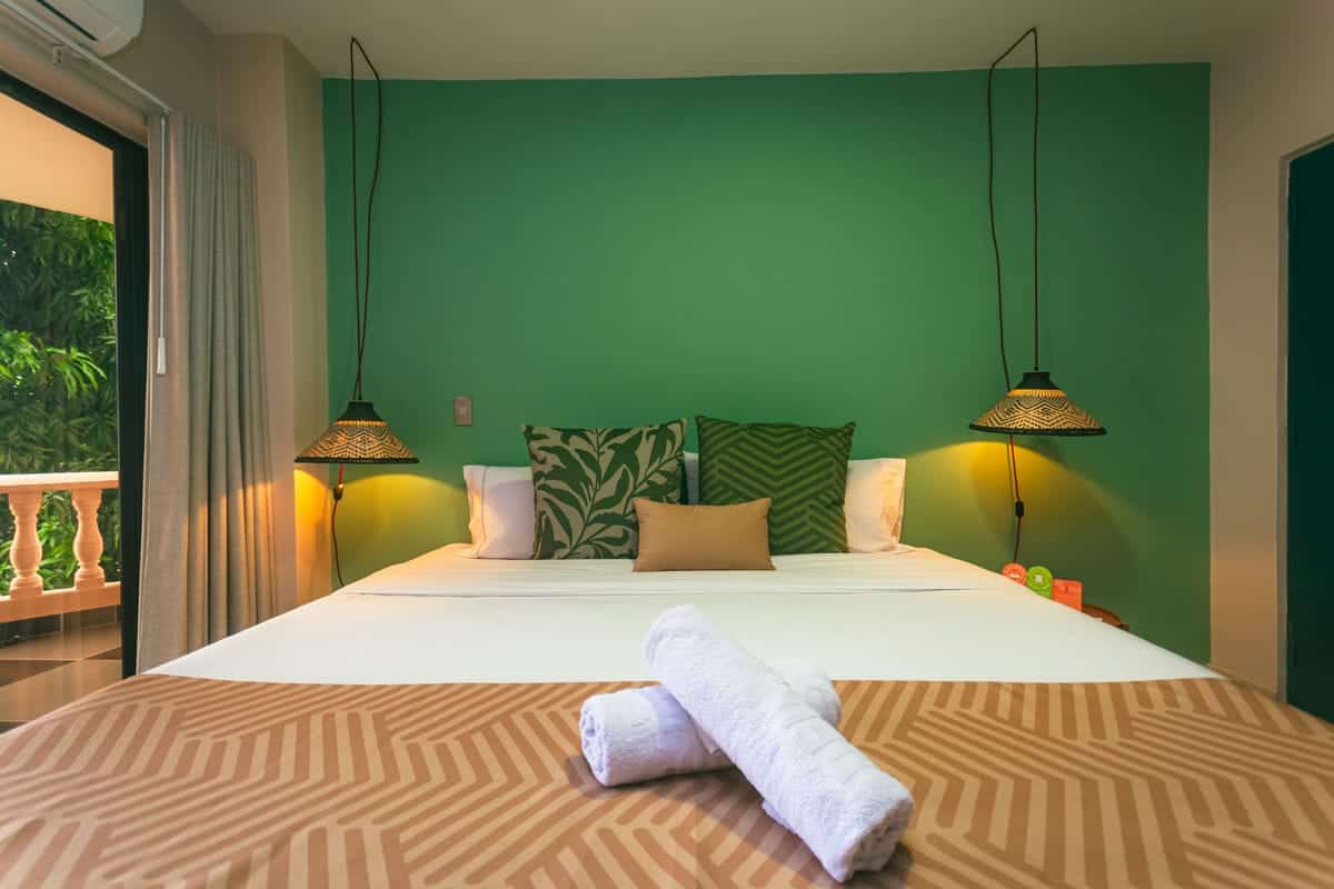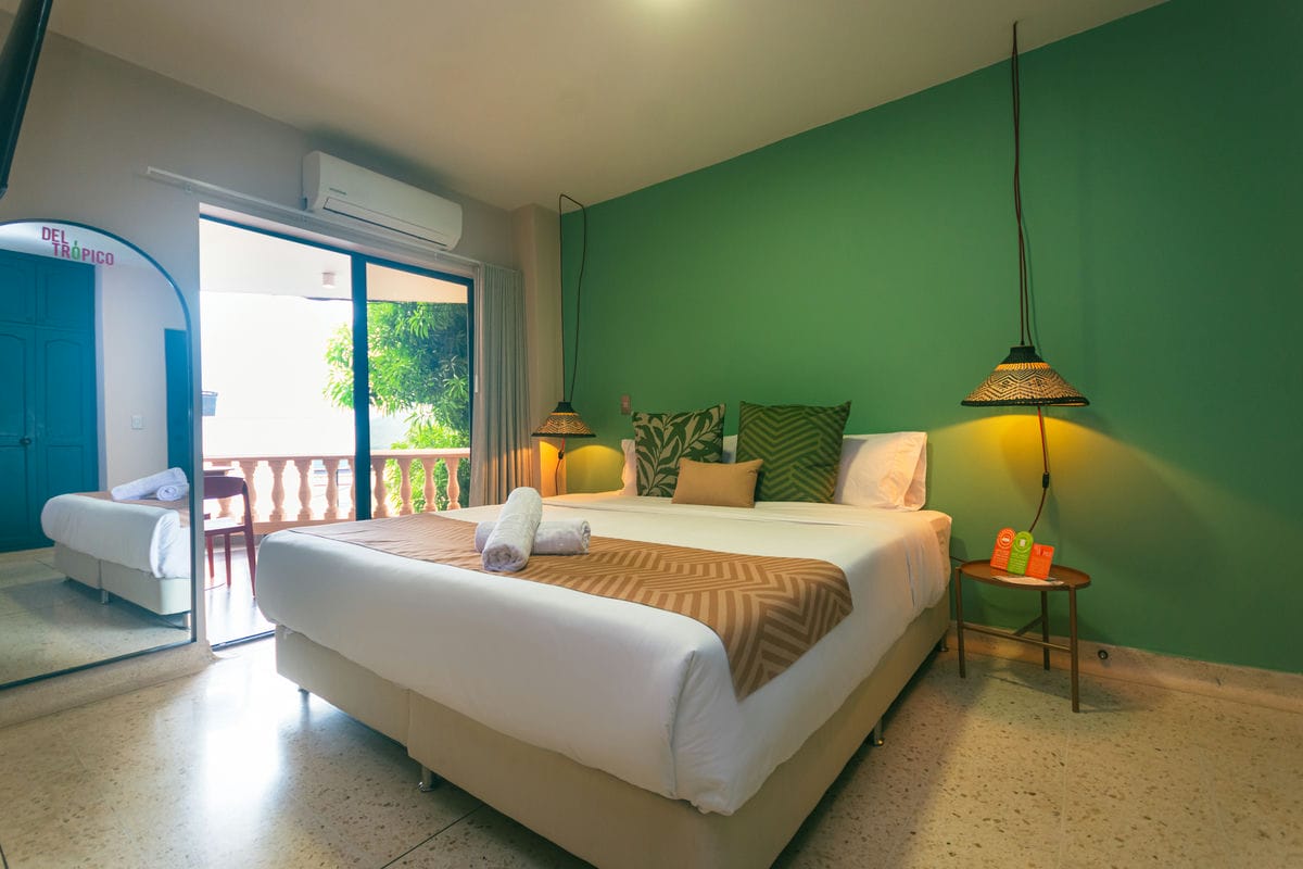 Amplia y luminosa, esta habitación es ideal para familias o grupos que desean compartir sin renunciar a la comodidad. Su balcón privado y su ambiente tropical se combinan con aire acondicionado, agua caliente, pantalla plana, toallas, batas y amenidades de lujo para una estadía placentera.